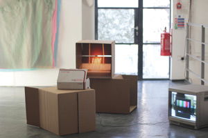 cardboard boxes with inkjet print, CRT-monitor (dvd 3mins loop)